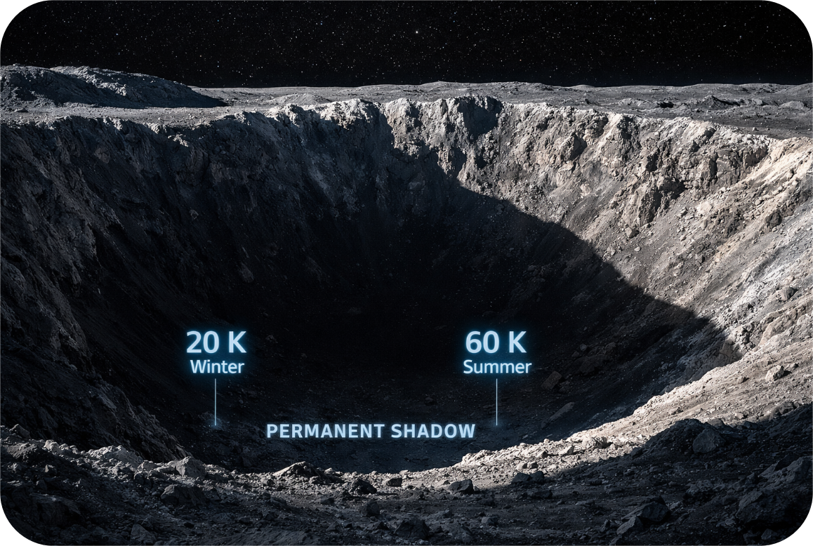 This is where the permanently shadowed regions become genuinely exciting. NASA’s Lunar Reconnaissance Orbiter has monitored temperatures in these craters for over a decade. What it found is almost paradoxical, the most remote and hostile places on the Moon are also, for an optical physicist, unusually hospitable.
