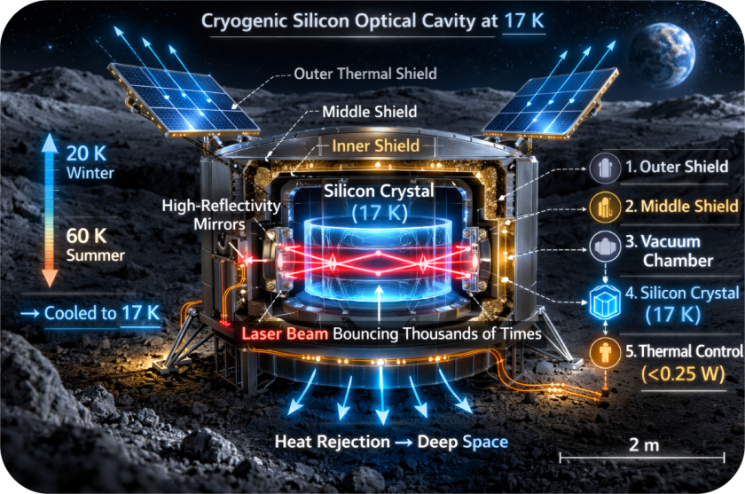 In a paper published on arXiv Lunar Silicon Cavity in February 2026, researchers lay out a detailed case for deploying a cryogenic silicon optical cavity, essentially a crystal chamber that locks a laser beam to an extraordinarily stable frequency, inside one of these eternal lunar shadows.