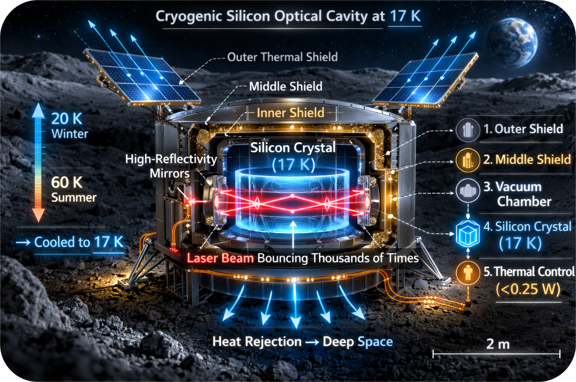 Once on the surface, the system architecture is relatively straightforward. The thermal management scheme draws directly on heritage from missions like JWST and the far-side seismic suite deployed by China’s Chang’e-4 lander. The cavity itself sits inside three nested thermal shields; two radiators face deep space, an active thermal controller maintains the crystal at 17 K with less than a quarter of a watt of heating power.