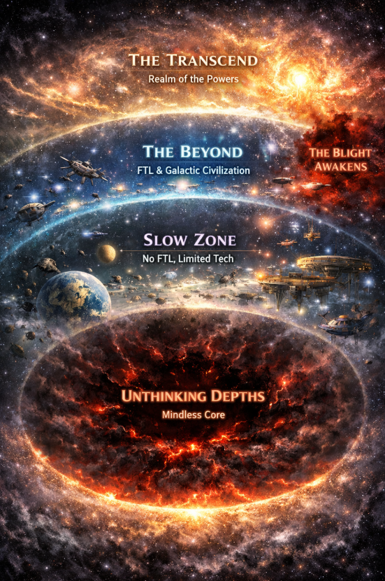 But as you move toward the galactic rim, you enter the Beyond. Here, the “constant” of light speed loosens its grip. Computation becomes more efficient, artificial intelligence can transcend human limits. Beyond that lies the Transcend, a realm inhabited by “Powers”, entities so advanced they are essentially gods, though they often “Archive” themselves or vanish into states of being we cannot comprehend.