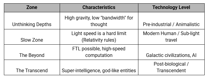 The central conceit of the novel is the Zones of Thought. It’s like imagining that our galaxy is not a uniform vacuum, but as a layered ocean (as depicted in image above, created from chatgpt). Near the dense galactic core lies the Unthinking Depths, where even the simplest biological intelligence struggles to function. Moving outward, we find the Slow Zone, the Earth, where the laws of physics are stubborn, and the speed of light is still a mystery.